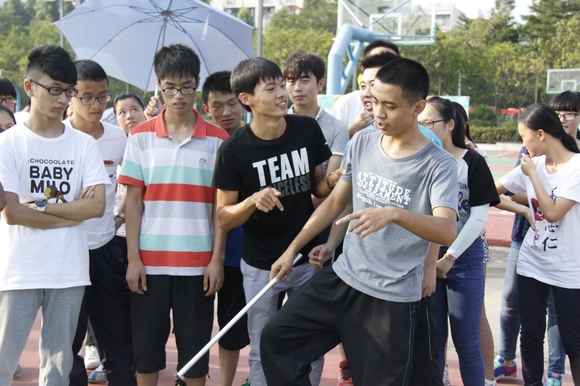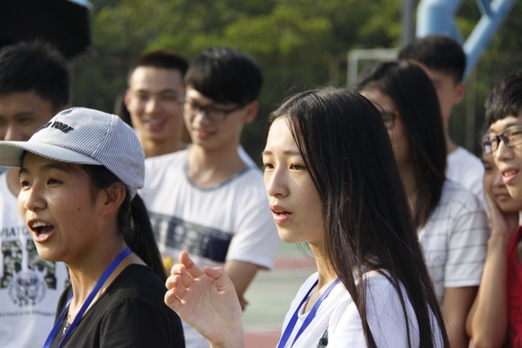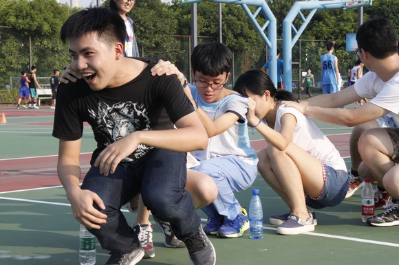 下午,烈日当头,但15级的新生满腔热情,不畏炎日,全员到齐。四点左右,趣味运动会正式开始。“赶猪跑”为第一个游戏,队员拿着棍子带球绕过障碍物,一个来回后,下一位队员接力带球继续向前。各班的啦啦队在比赛场旁,不停地为参赛选手呐喊助威,现场的气氛随着游戏的进行而活跃起来。