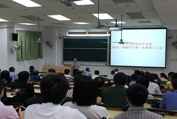 全体教师在文清楼110室召开了新学期全体教师大会,围绕“聚共识、谋发展、抓落实,全面推进高水平大学建设”的主题,曹道明院长、黄志凯书记,以及其他学院领导就自己的分管工作分别作了主题发言。