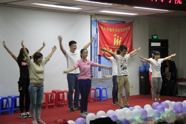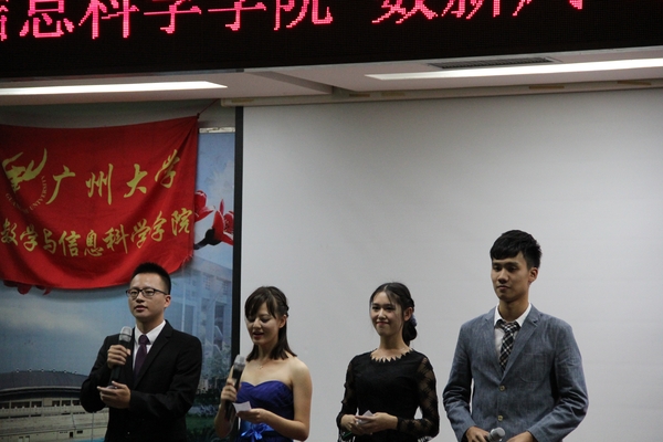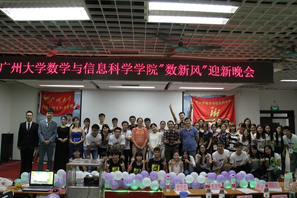 2015年10月14日,2015级“数新风”迎新晚会在讲学厅如期举行。出席本次活动的嘉宾有党委副书记曾学毛同志、学工办主任兼2012级辅导员顾书老师、学院团委书记兼2013级辅导员杜亚辉老师、2014级辅导员胡啟岚老师、2015级辅导员陈启彪老师、2015年导生组、数院团委学生会主席团以及各部门部长。