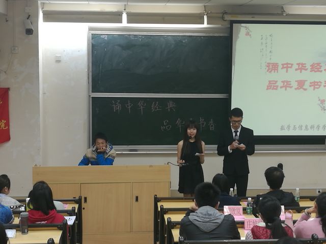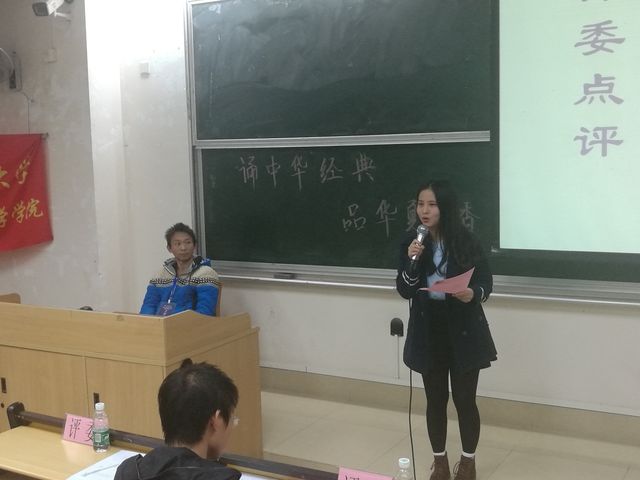 中华经典诵读比赛在文新119举行。参加本次活动的嘉宾有团委书记兼2014级辅导员胡啟岚老师和2016级辅导员何燕惠老师以及团委副书记康子浩、团委副书记庄婷婷、学生会主席陈丹敏和学生会秘书长何菊珍。本次比赛的评委为肖俊婷和于景任。