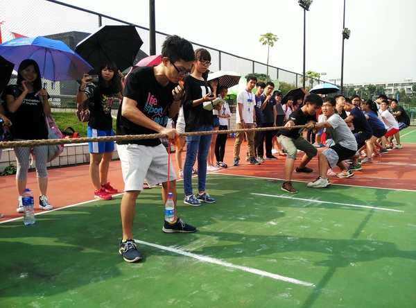 在梅苑排球场开展新生杯拔河争夺赛。到场的嘉宾有成人影院