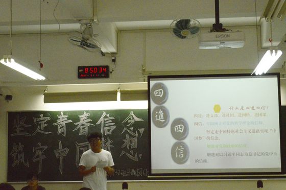 大会在中华人民共和国国歌中拉开帷幕,一段关于五四运动的视频将老师和同学们带进历史的现场,一段关于“四进四信”的宣传视频又将大家带回到生活的当下,也让同学们体会到“进网络”这一宣传方式的鲜活和生动。为了让大家对五四运动和“四进四信”加深了解和体会,团支部精心准备了相关的知识问答并准备了小礼品作为奖励,同学们踊跃回答主持人提出来的问题,现场气氛十分活跃。接着,成人影院