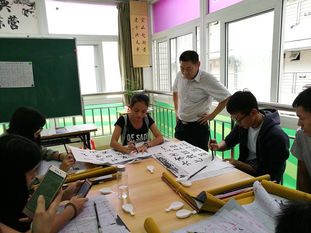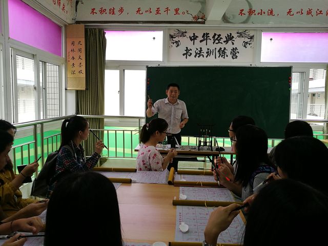 继苗老师演示之后同学们也开始动手模仿苗老师的姿势开始练习。随着同学们的跃跃欲试,活动也进入到白热化阶段。在这期间苗老师甚至用磁铁把水写布贴在黑板上一笔一划地指导大家,防止在大家练习的时候大家走弯路。