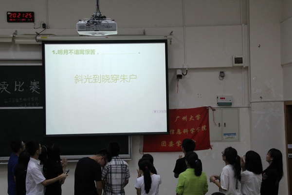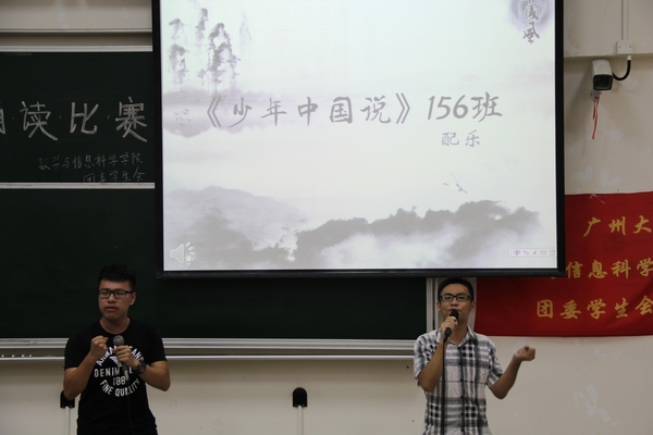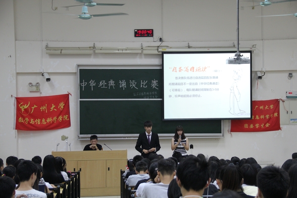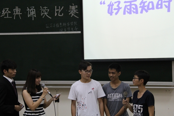 2014年“中华经典诗文朗诵”三等奖获奖者林政、现辩论队队长肖俊婷、获得2014年“发现广大之美”校赛二等奖于景任担任此次比赛的评委。本次比赛共分为三个环节,第一环节是配乐朗诵,第二环节是知识问答,第三环节是四强争霸。