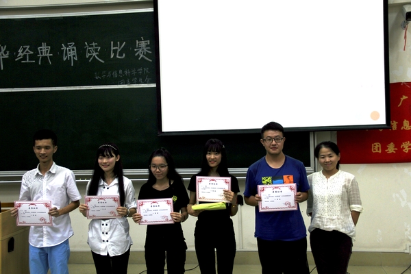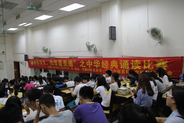 2015年11月20日7点整,我院举办的中华经典诵读比赛在文新208拉开了帷幕。出席本次比赛的嘉宾有我院党委副书记曾学毛同志、学工办主任兼12级辅导员顾书老师、院团委书记兼13级辅导员杜亚辉老师、14级辅导员胡啟岚老师以及学院团委学生会主席团。