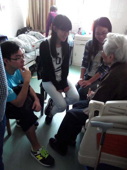 经过大约一个小时的车程,同学们到达了目的地。首先,由福利中心的社工为大家讲解老人们的生活习惯以及需要注意的细节。随后,在社工的带领下,同学们熟悉福利中心老人们的住处,同时走近一些起床的老人,与他们交流。有的身体健康的老人在走廊玩游戏,同学们就会加入他们,给游戏增加一些趣味性,使他们笑得更开怀;有的老人独坐在房间,同学们就会与他们坐在一起交流,这时他们大多会回忆他们的往事,而同学们在旁边认真的倾听,也让同学们感慨老一辈人的生活不易。