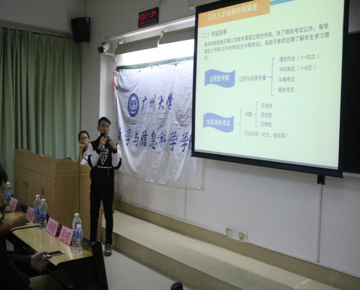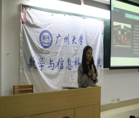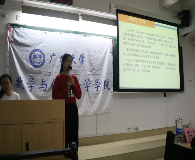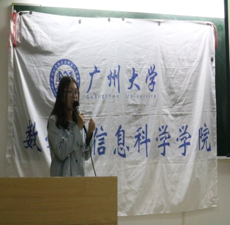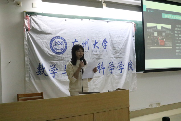 第一个是访学小组18级的本科生代表丁圣琪进行发言,丁圣琪同学向我们分享了川大的概况以及在川大课堂的学习经历。川大上课的课室前排都是满的,而且上早课没有出现打瞌睡现象,并通过举一些例子:例如川大的12点准时断电断网等,与我们进行对比,来反映我们自身的不足之处,并加以改进。