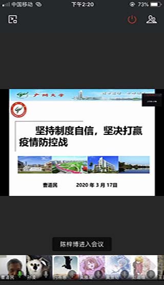 曹道民院长以“坚持制度自信,打赢疫情防控战”为主题,围绕“国内外疫情防控形势”“党员力量”“民族精神”三个部分展开。曹院长首先从“急人民之所急”、“解人民之所困”、“想人民之所想”三个方面向全体学生干部介绍了在疫情发生以后,党和国家为扭转疫情形势采取的一系列强有力的疫情防控举措,并通过对比分析国内外疫情发展局势,深刻剖析了社会主义制度的巨大优越性。随后,曹院长带领学生观看了“总书记指挥这场人民战争--不负人民”的视频,并通过展示抗疫中的一个个感人事迹,向同学们诠释了党员的先锋模范作用和“我是党员,我先上”的精神内核,展现了“上下一心,众志成城”的民族风貌以及中华民族在面对民族危难时的强大凝集力。最后曹院长勉励同学们要珍惜时间,排除线上学习的干扰,扎实学好专业知识,将来积极投身到祖国的建设中去,为中华民族伟大复兴贡献自己的力量!