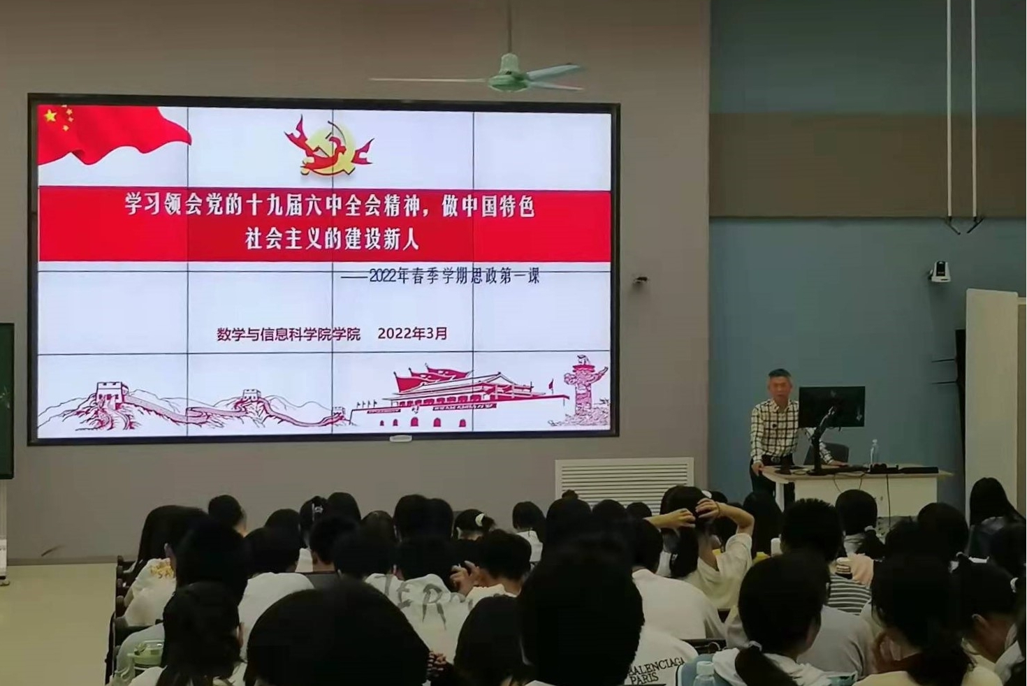 3月11日,彭济根院长以“学习领会党的十九届六中全会精神,做中国特色社会主义的建设新人”为题,为数学211、213、214、215班同学们讲授“思政第一课”。